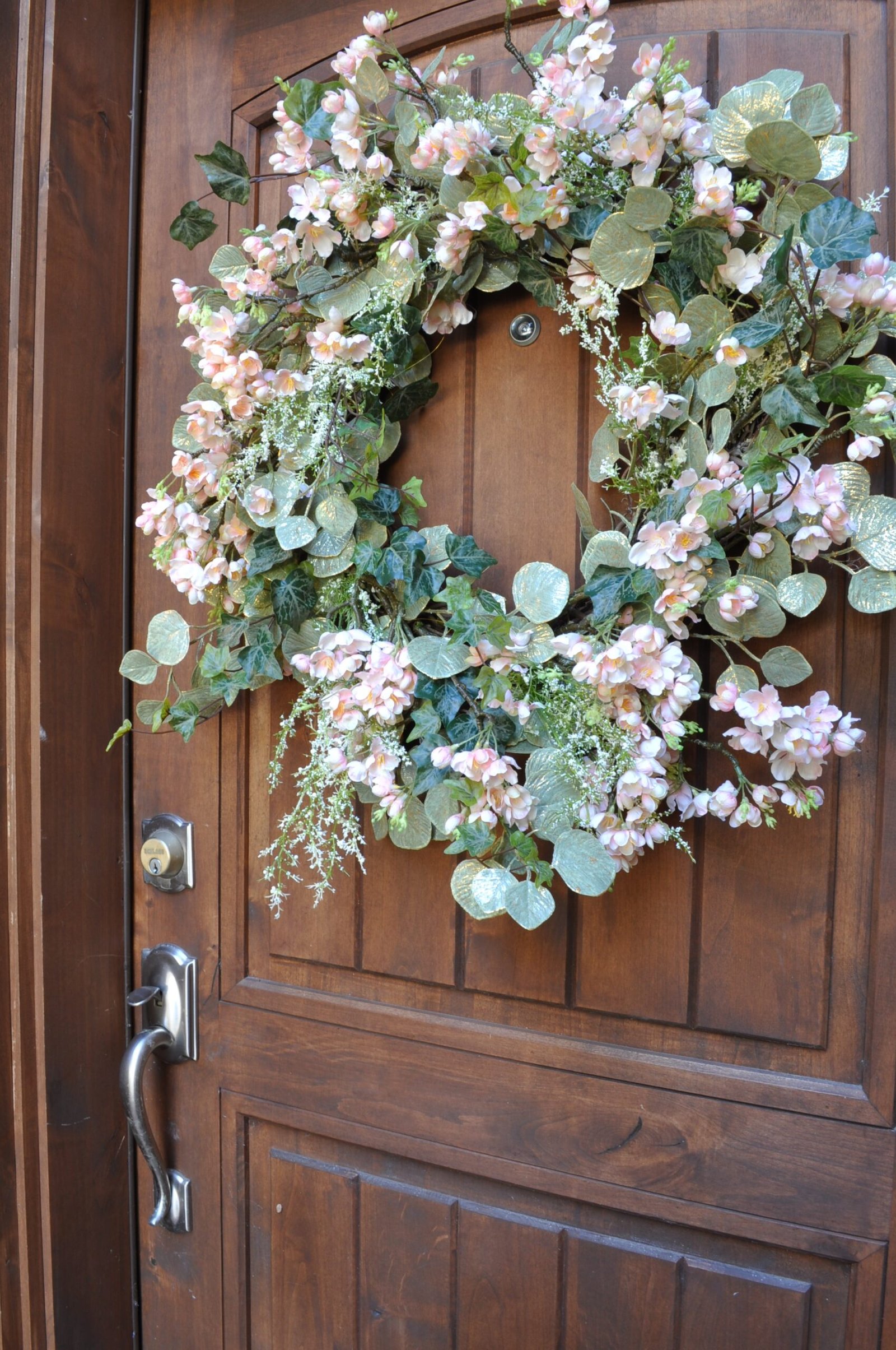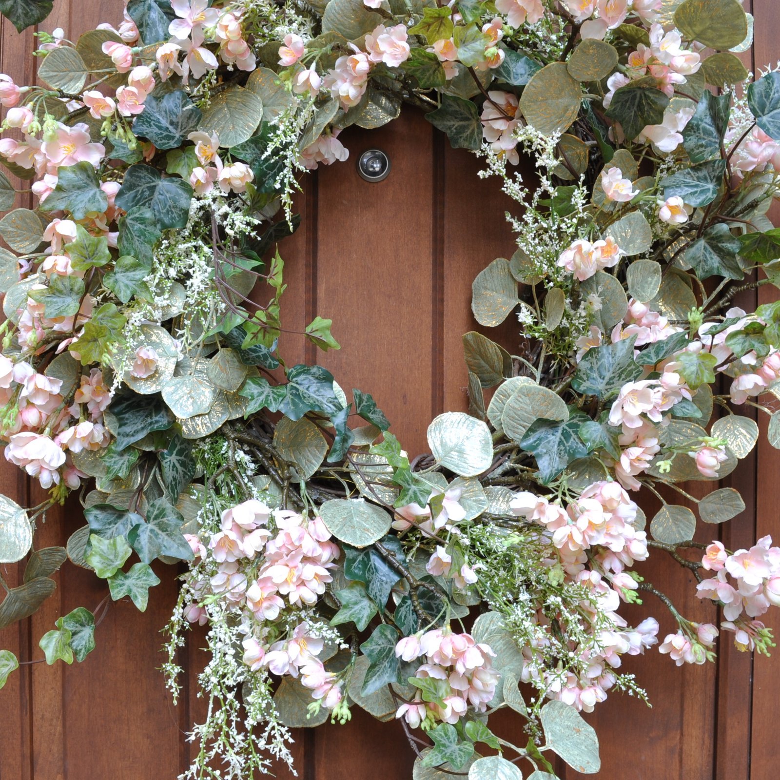 Welcome the fresh beauty of spring with this romantic Apple Blossom & Silver Dollar Eucalyptus and Ivy wreath, featuring delicate pale pink apple blossom branches intertwined with lush, silvery-mint metallic green eucalyptus leaves. This airy, nature-inspired spring wreath design brings a soft, whimsical charm to any space, perfect for front doors, mantels, or wall décor.