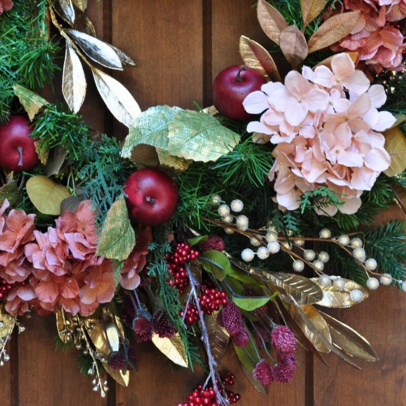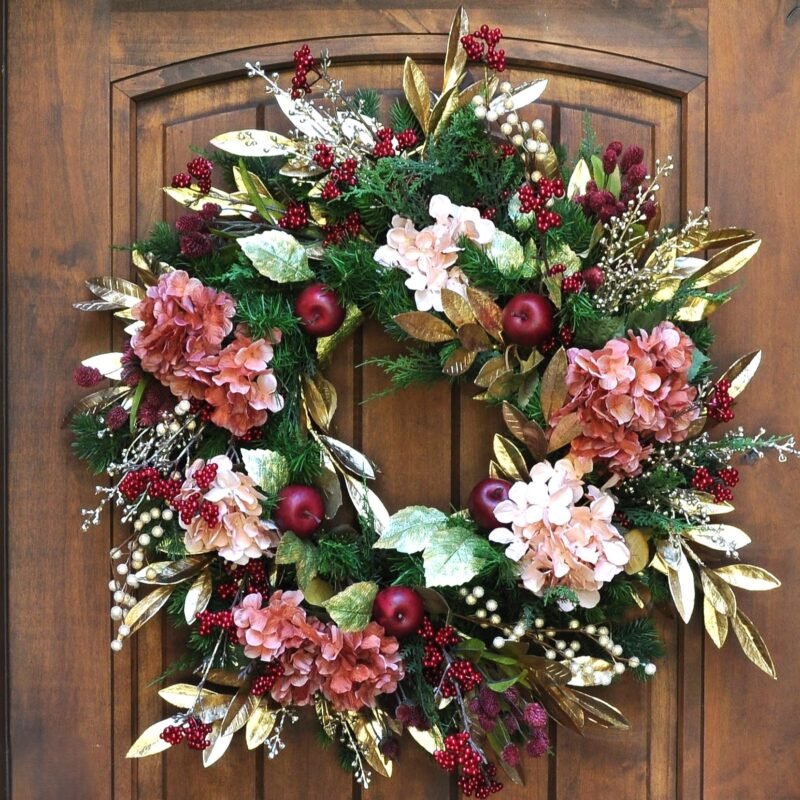 Wow your guests with this glamorous Apple & Hydrangea Christmas wreath. Classic red apples and pepper berry stems mix with blush and coral hydrangeas to bring the holidays to life. This wreath will look stunning on your front door to welcome guests or over a fireplace mantle.
