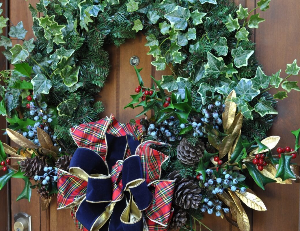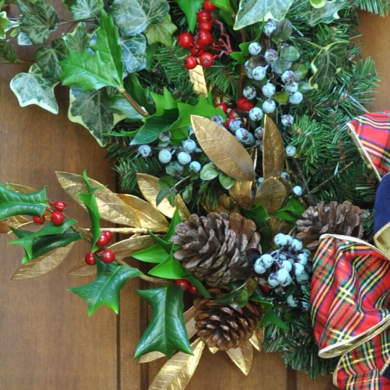 Elegant and captivating, the Blue Christmas Ivy Wreath brings a sophisticated, Williamsburg holiday touch to your seasonal decor. Inspired by the tradition and rich natural beauty of Colonial Christmas, this stunning wreath features lush, variegated ivy intertwined with classic evergreens and rich red holly berries. Accents of cool, frosted blue berries and natural pine cones add unique texture and a wintery charm, while shimmering gold leaves provide a touch of glamour.
