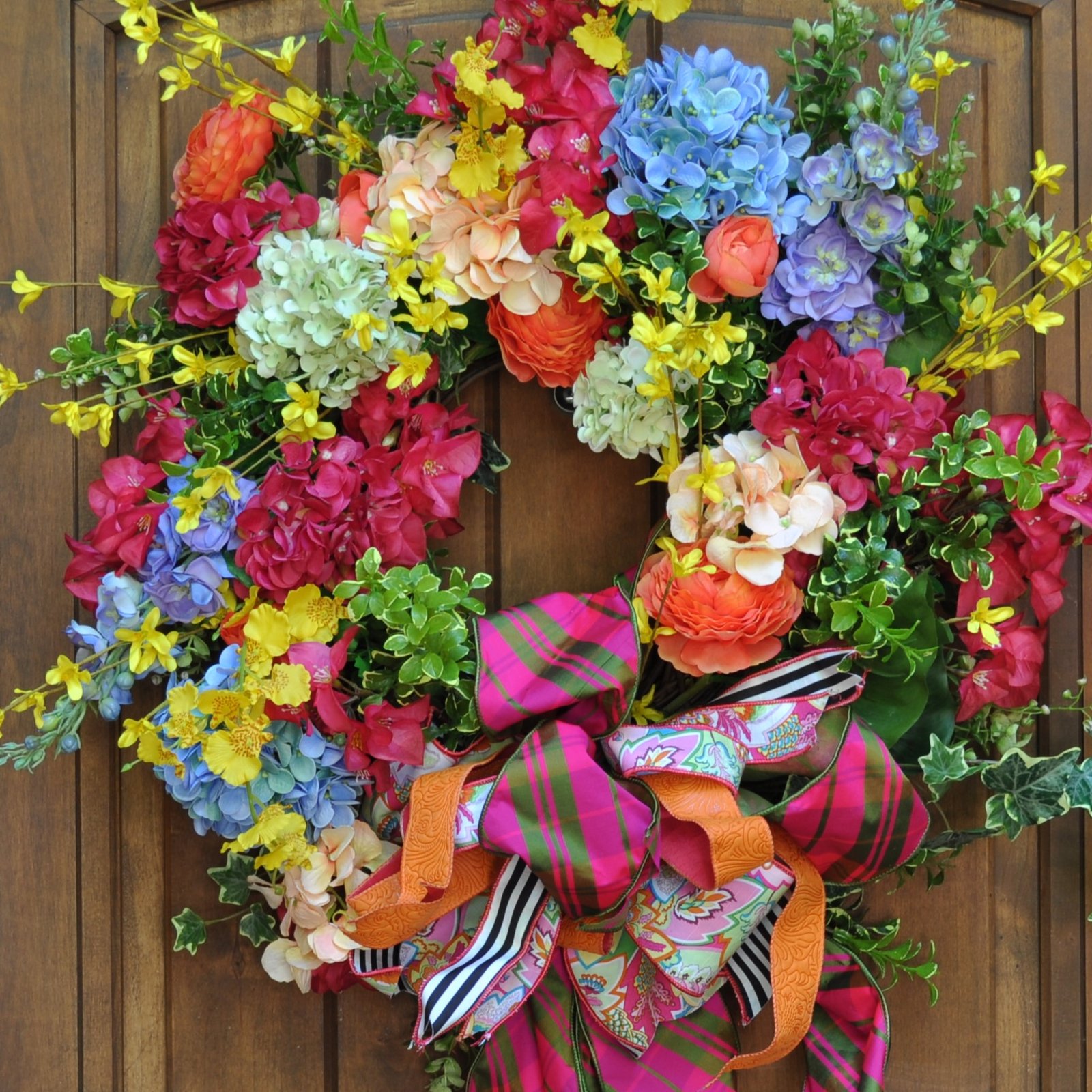 Who’s ready for a party? Meet Fiesta Texas, the newest designer wreath in our summer collection. Handcrafted with Real Touch florals, this wreath radiates fun in the sun. It features vibrant tropical bougainvillea, orange ranunculus, multicolored hydrangeas, delphiniums, forsythia branches, and elegant orchids.