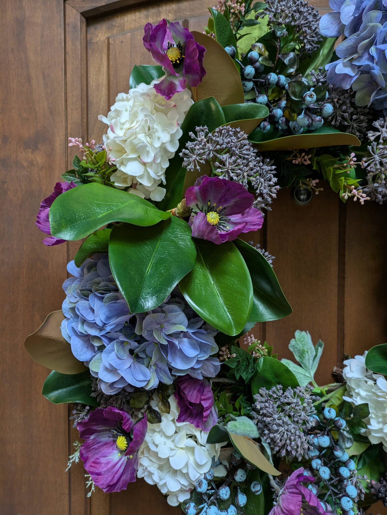 Featuring lush clusters of blue and white hydrangeas, reminiscent of reflected skies and rippling water, the wreath is accented with deep purple poppies that add a dramatic, painterly contrast. Textural allium blooms offer depth and whimsy, while rich magnolia leaves and faux blueberries add an organic, garden-picked authenticity.