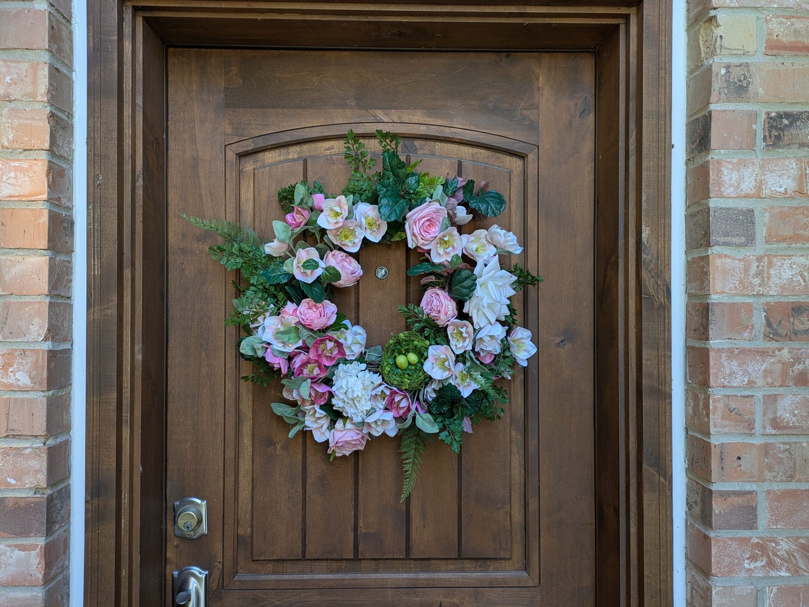 Bring the beauty of spring to your home with this 24″ Romantic Easter spring wreath featuring soft pink hellebores, roses, and hydrangeas layered with ferns, creeping charlie, and mint leaves. A charming moss nest with eggs adds a subtle spring touch, making it perfect for front door decor, spring decorating, or Easter celebrations.