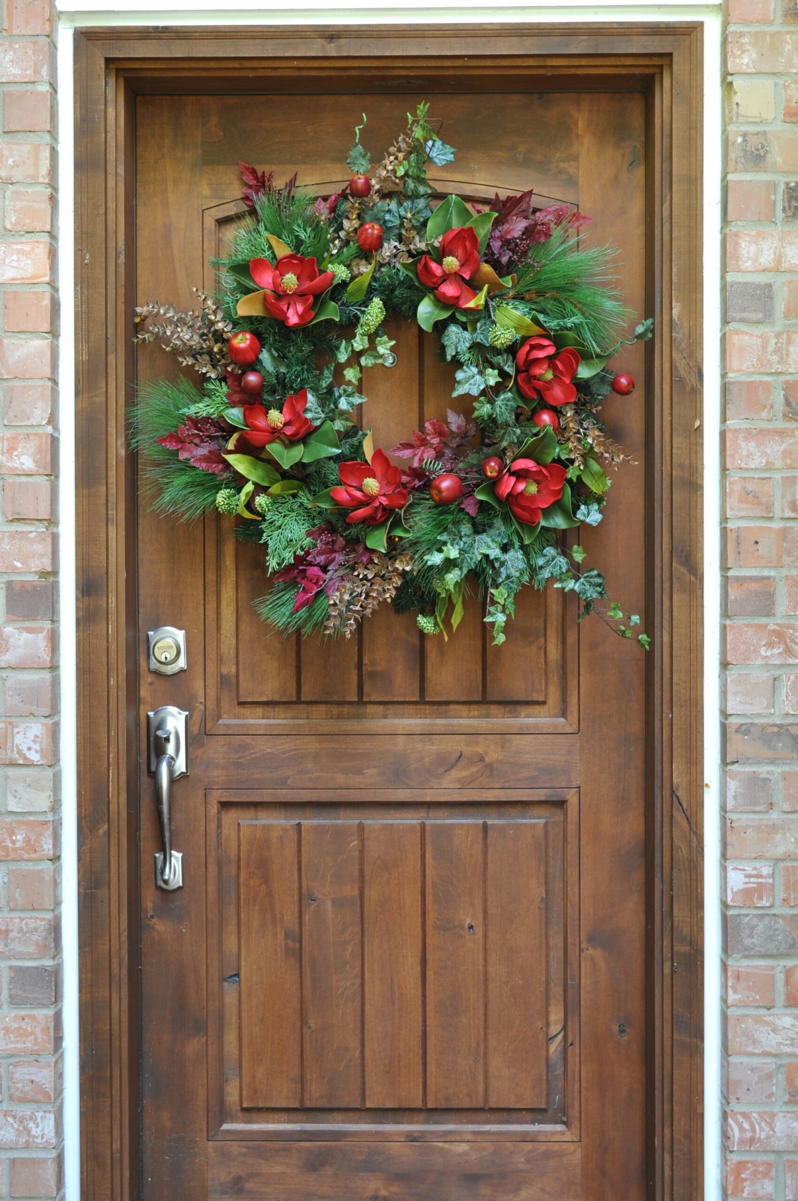 Elegant and timeless, the Magnolia & Apple Christmas Wreath captures the beauty of the season with bold red magnolia blooms, natural evergreens, and glossy foliage. Bright apple accents and rich seasonal greenery add texture and charm, making this wreath a sophisticated statement piece for your holiday décor. Whether greeting guests at your door or hanging as an indoor focal point, this handcrafted wreath brings festive warmth to every space.