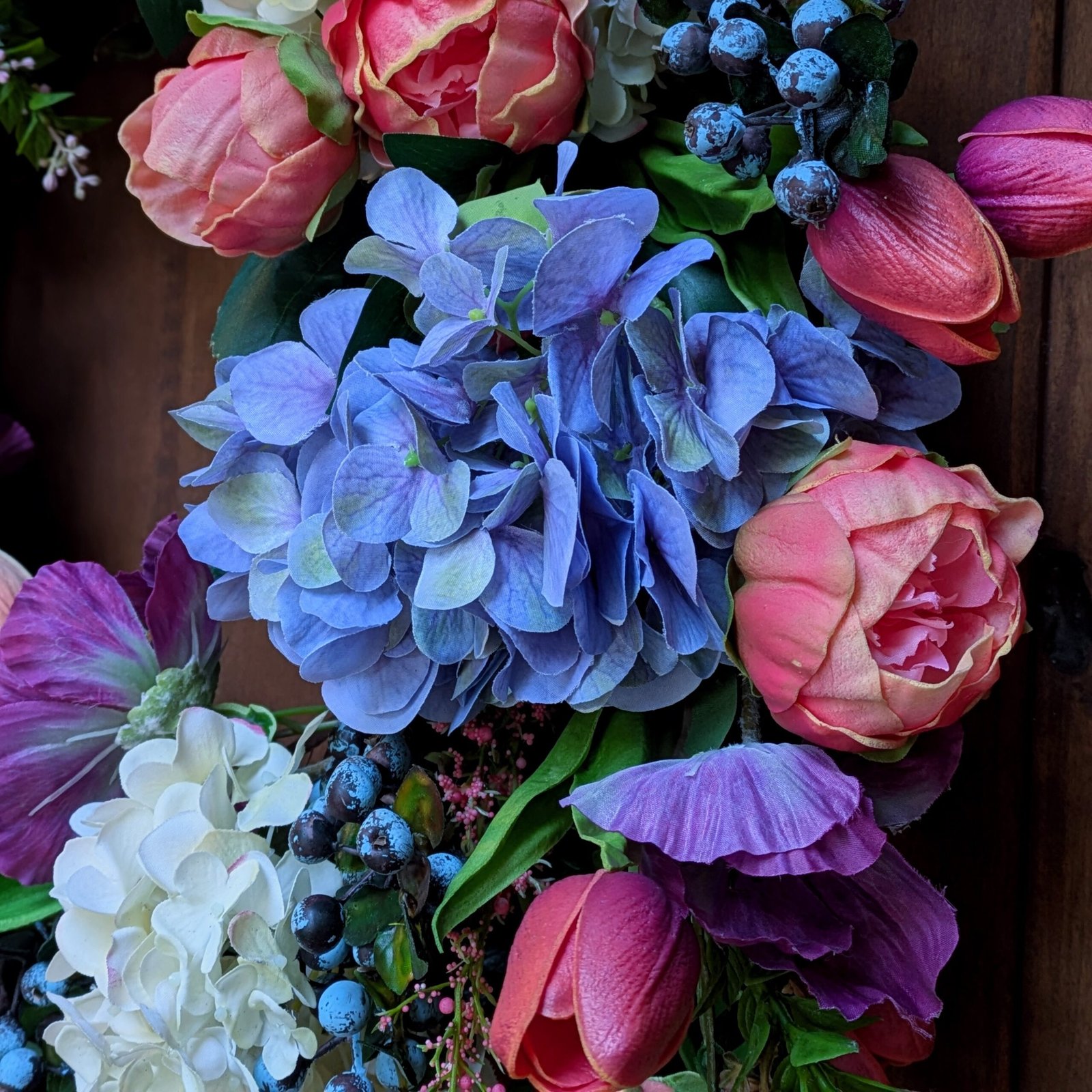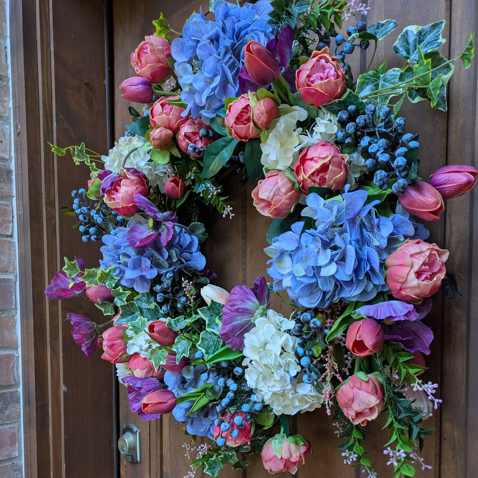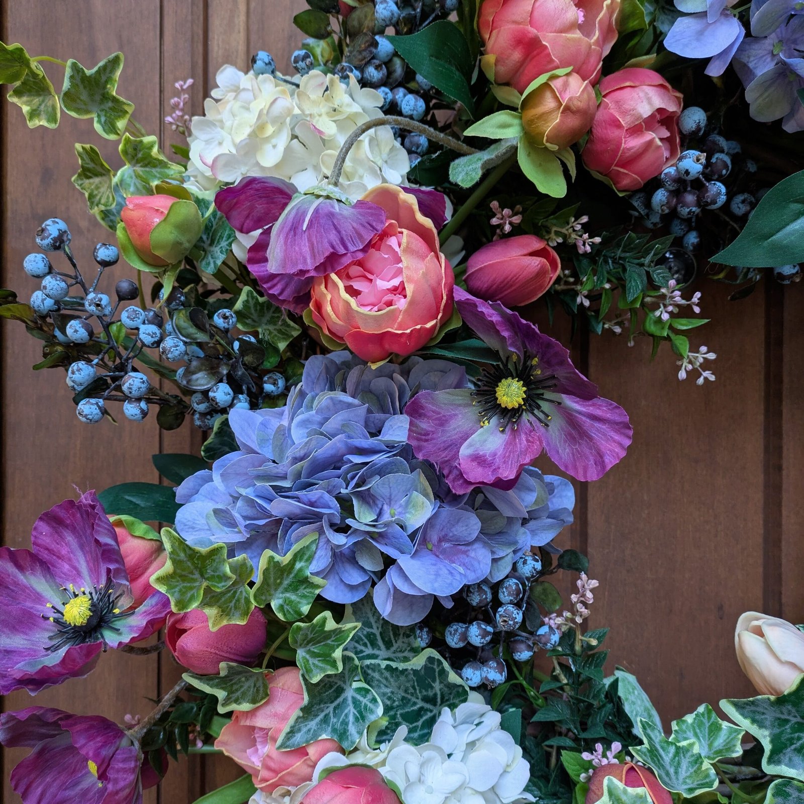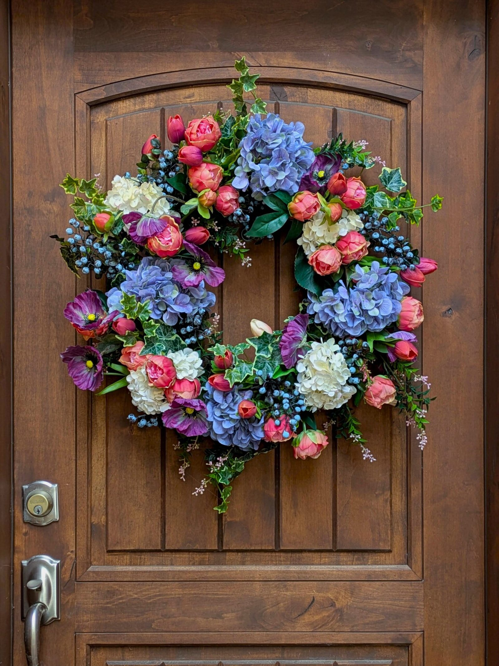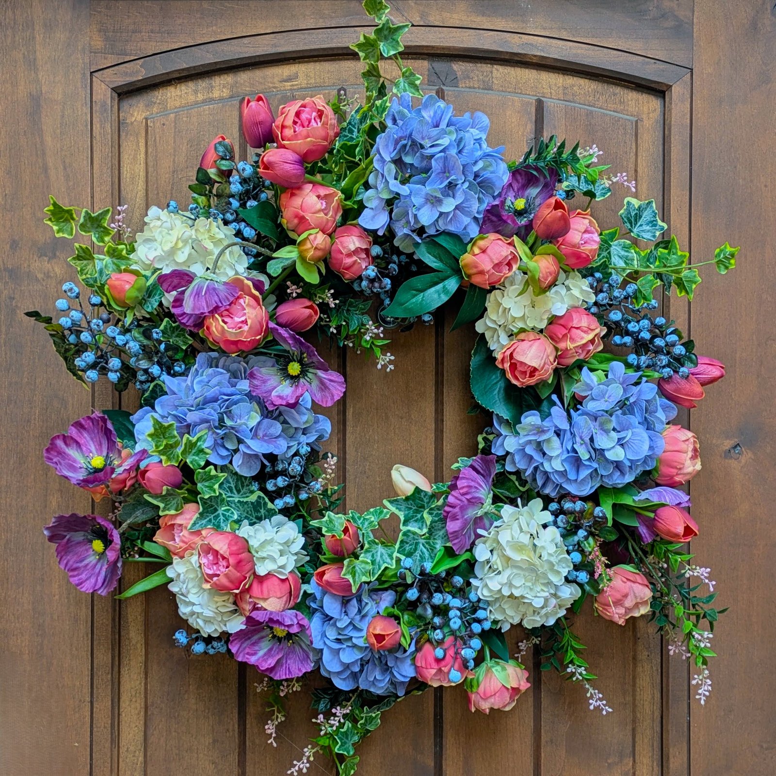 This is the second spring garden wreath in our spring collection. It is a parade of colors that feels as fresh as flowers cut straight from your garden. Fuchsia tulips and purple poppies dance around this wreath, adding movement to the design. This vibrant garden wreath is an enchanting blend of color and texture. Blue and white hydrangeas, pink peonies, blueberries, and variegated ivy complete the vibrant color palette. Welcome Spring with this beautiful garden bouquet wreath.